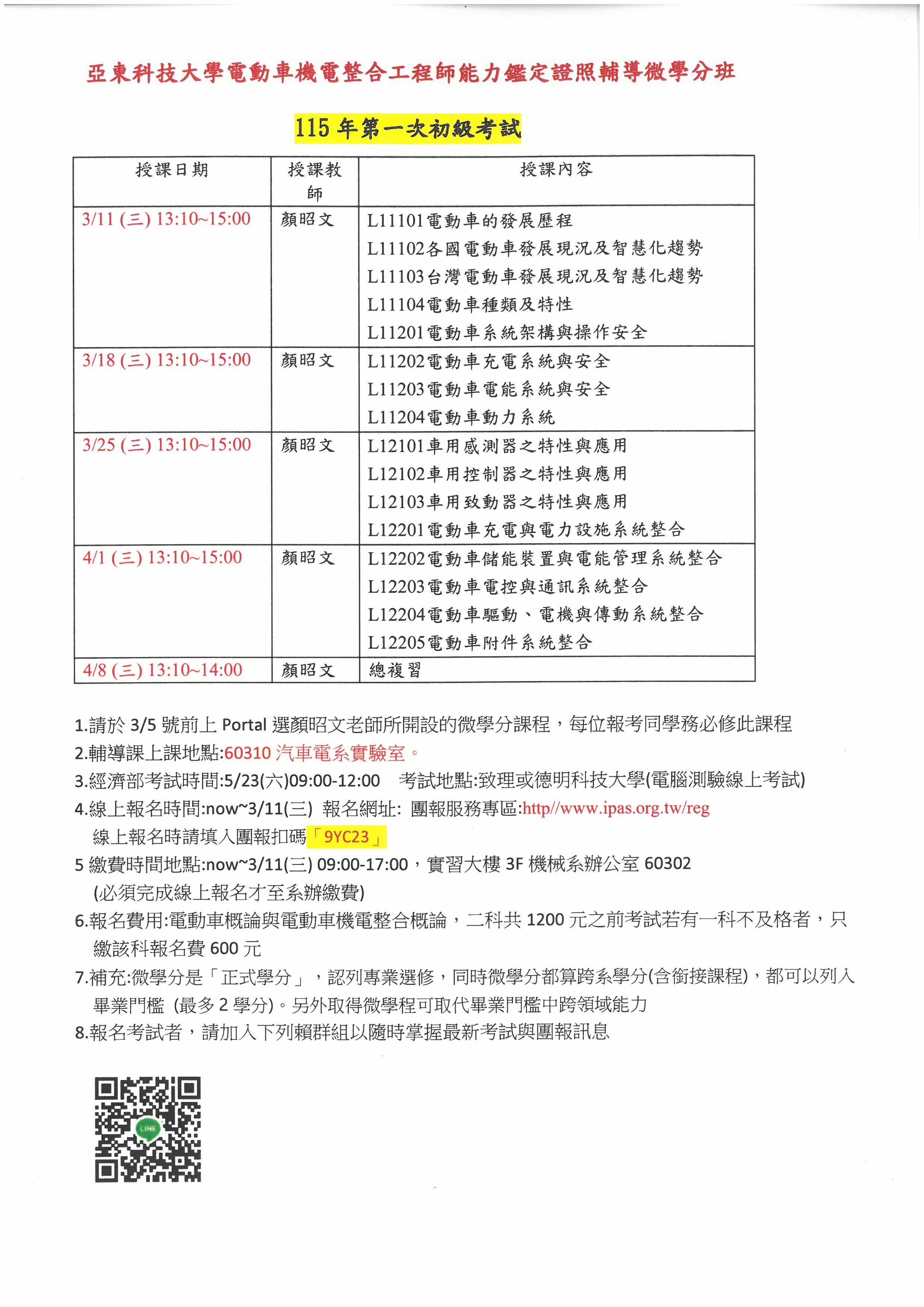 iPAS115年第一次電動車證照輔導班課表(含證照報名資訊)